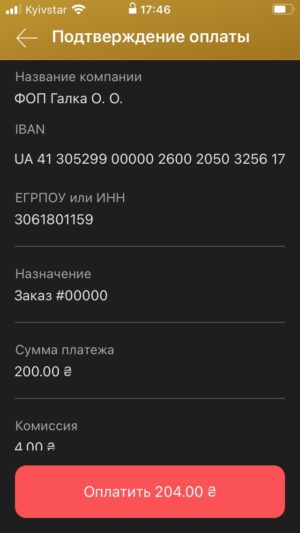 Введіть суму платежу. У полі Призначення вкажіть номер замовлення. Натисніть кнопку “Продовжити”