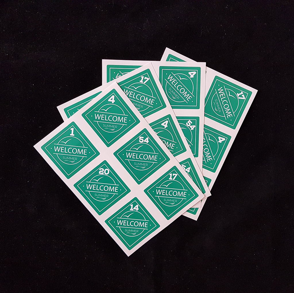 - Стандартні наліпки з самоклеящейся паперу і ПВХ-плівки різної кольоровості, розмірів і форм;